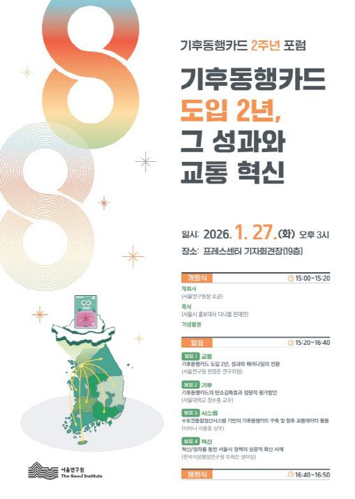 이번 포럼은 서울시 대표 기후·교통 정책인 기후동행카드의 성과를 교통·기후·시스템·행정 등 다양한 시각에서 분석하고, 대중교통·기후 정책의 새로운 패러다임 전환을 논의하기 위해 마련됐다. 포럼은 오균 서울연구원장의 개회사를 시작으로, 다니엘 린데만 서울시 홍보대사의 축사 및 사례 공유, 주제 발표, 폐회식 순으로 진행된다.