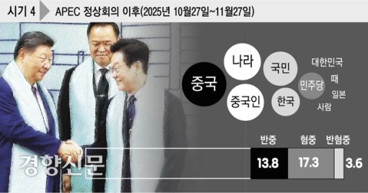 ‘시기 1’은 2022년 2월8~9일 베이징 동계올림픽 당시 개회식에서 조선족이 한복을 입고 등장하고 쇼트트랙 편파판정 논란이 있던 때, ‘시기 2’는 2024년 12월12일 윤석열 전 대통령이 계엄 이후 4차 담화에서 ‘중국’을 언급한 이후다.