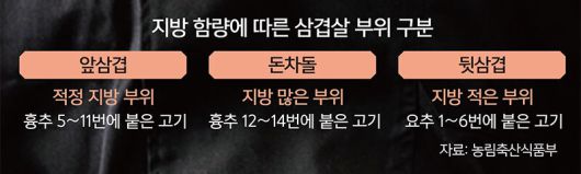22일 농림축산식품부의 ‘축산물 유통구조 개선 방안’에 따르면 앞으로 삼겹살은 지방 함량에 따라 △적정 지방 부위는 ‘앞삼겹’ △지방이 많은 부위는 ‘돈차돌’ △지방이 적은 부위는 ‘뒷삼겹’으로 구분된다. 앞삼겹은 돼지의 흉추 5번에서 11번까지 붙어 있는 고기로 지방량이 적당한 게 특징이다. 삼겹살 중간 부위에 해당하는 흉추 12번에서 14번 사이의 돈차돌은 지방이 가장 많다. 뒷삼겹은 요추 1번에서 6번까지 부위로 지방이 적은 부위다.