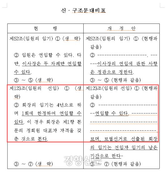 중소기업협동조합법 개정안은 ‘1회에 한정해 연임할 수 있다’고 돼 있는 중기중앙회 회장 연임 관련 조항을 삭제하는 것을 골자로 한다. 정진욱 민주당 의원이 대표발의한 것으로, 지난달 31일 민주당 의원 8명 등 총 10명이 발의했다. 이들은 개정안을 제안한 배경으로 “임원 연임 횟수를 법률로 제한하고 있어 조직 운영의 자율성과 독립성을 과도하게 제약한다는 지적이 제기되고 있다”고 밝혔다.