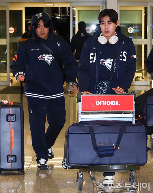 [인천공항=스포츠투데이 팽현준 기자] 한화 이글스 강백호, 심우준이 2026 시즌 준비 스프링캠프를 위해 23일 인천국제공항에서 출국을 준비하고 있다. 2026.01.23. [스포츠투데이 팽현준 기자 sports@stoo.com]