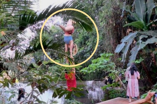 태국 치앙마이에 위치한 왓파랏 사찰에서 한 관광객이 노출 심한 옷을 입고 아크로 요가 중인 모습. /사진=뉴시스(SNS 캡처) |