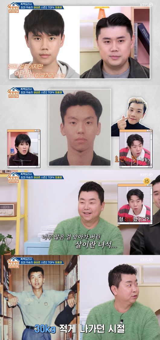 홍진경은 “저때 비하면 지금 몇 kg 찐 거냐”고 했고, 정호영은 “저때 비하면 지금 30kg 쪘다”고 밝혔다. 이에 김종국은 “빼면 좋겠다. 외모가 있다. 매력있는 얼굴인데”라고 감탄했다.