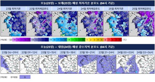 하늘은 대체로 흐린 가운데 아침까지 충남 서해안을 중심으로 한 때 눈이 조금 내릴 전망이다. 밤부터 24일 새벽 사이 내륙에서도 0.1㎝ 미만의 눈발이 날리는 곳이 있겠다.