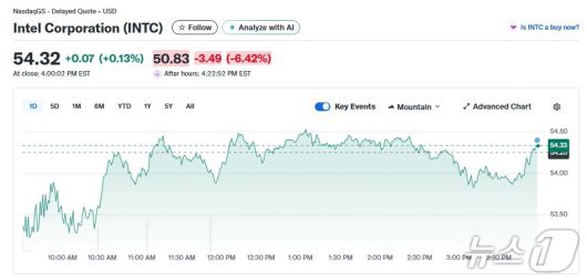22일(현지 시각) 뉴욕증시 시간외거래에서 인텔은 6.42% 급락한 50.83달러를 기록하고 있다. 앞서 정규장은 0.13% 상승, 마감했었다. 시간외거래에서 인텔의 주가는 한때 8%까지 급락했었다.