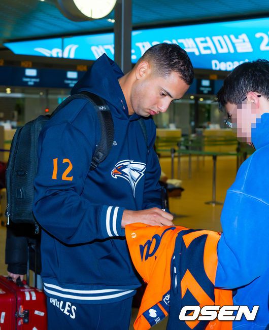 [OSEN=인천공항, 민경훈 기자] 프로야구 한화 이글스가 2026 시즌을 준비하기 위해 23일 오전 인천공항을 통해 호주 멜버른으로 1차 스프링캠프를 떠났다. 김경문 감독이 이끄는 한화 선수단은 코치진 17명, 선수 46명을 합해 63명으로 1차 스프링캠프 명단을 꾸렸다. 한화 에르난데스가 출국길에 오르며 팬들에게 사인을 해주고 있다. 2026.01.23 / rumi@osen.co.kr