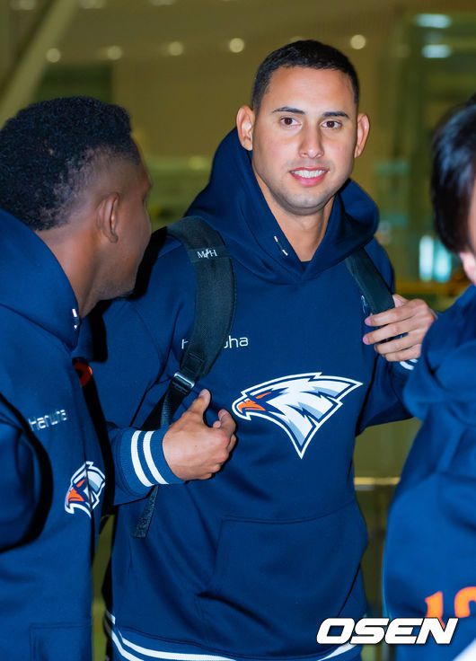 [OSEN=인천공항, 민경훈 기자] 프로야구 한화 이글스가 2026 시즌을 준비하기 위해 23일 오전 인천공항을 통해 호주 멜버른으로 1차 스프링캠프를 떠났다. 김경문 감독이 이끄는 한화 선수단은 코치진 17명, 선수 46명을 합해 63명으로 1차 스프링캠프 명단을 꾸렸다. 한화 에르난데스가 출국길에 오르며 페리자와 얘기를 나누고 있다. 2026.01.23 / rumi@osen.co.kr