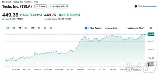 이 같은 소식으로 이날 테슬라는 4% 이상 급등한 것으로 보인다.