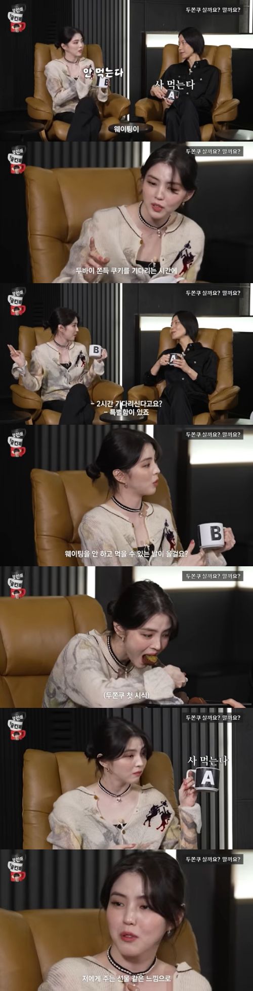 한소희는 '안 먹는다', 김신록과 정영주는 '사 먹는다'고 답했고, 한소희는 "이게 할 말이 있다. 웨이팅 2시간이면, 그 기다리는 시간에 밥 먹고 커피 마시고를 할 수 있다"고 말했다. 또한 "아마 조금 더 기다리면 웨이팅 안 해도 먹을 수 있는 날이 올 것"이라며 유행은 금방 지나간다고 예상했다.