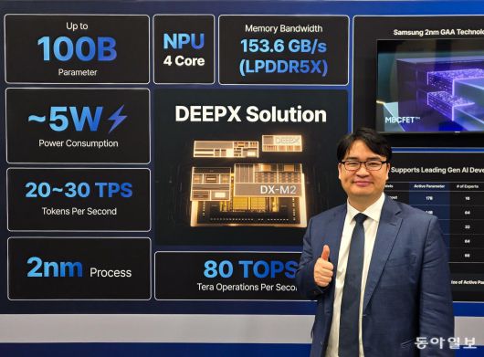 딥엑스는 CES 2026에서 2세대 NPU DX-M2의 개발 로드맵도 공개했다. DX-M2는 1세대 칩과 같은 양의 전력을 사용해 단일 기기 안에서 최대 1000억 파라미터(매개변수) 수준의 거대언어모델(LLM)도 구동할 수 있도록 설계됐다. 김 대표는 “딥엑스의 칩을 활용하면 생성형AI의 연산과 처리를 데이터센터 없이도 온디바이스로 할 수 있다”며 “피지컬AI 반도체 시장에서 1등이 되는 것을 목표로 하고 있다”고 밝혔다. 다음은 김 대표와의 일문일답.