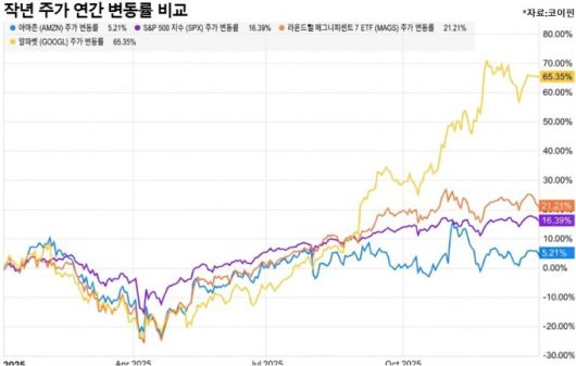 아마존의 주가는 작년 한 해 동안 5% 상승하는 데 그쳤다. 같은 기간 주가지수 S&P500이 16% 상승하고 M7 전체가 21% 뛴 것과 대조적이다. M7 종목 가운데 최고 성과를 낸 알파벳은 65%나 올랐다. 아마존 주가의 연간 성과는 작년까지 7년째 M7 전체 상승률에 미달했다.