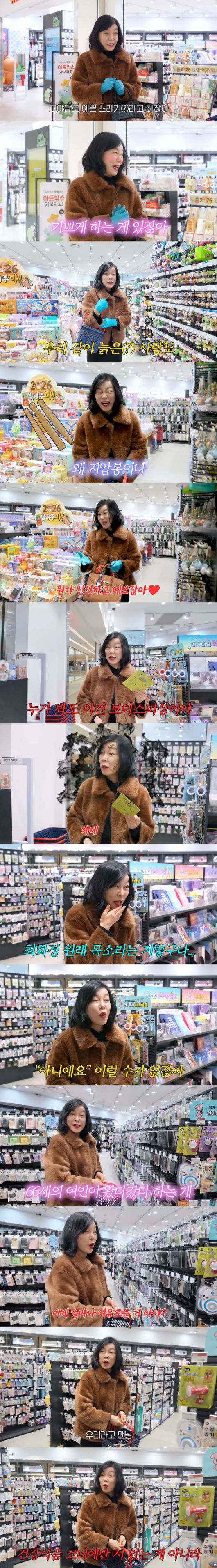 영상 속 최화정은 아트박스를 찾아 구경에 나섰다. 그는 "예쁜 쓰레기라고 하지 않나. 하지만 그게 너무 내 마음을 기쁘게 하지 않나"라며 "가격이 괜찮다. 그래서 막 사다보면 10만 원이 넘는다. 픽하는 거는 신중하게 골라야 한다"면서 본격 쇼핑에 나섰다.