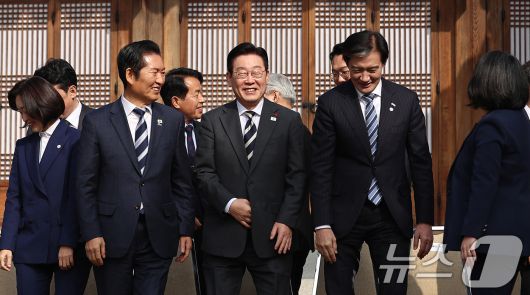 이재명 대통령이 지난 16일 청와대 상춘재에서 열린 정당 지도부 초청 오찬에서 기념촬영을 마치고 정청래 더불어민주당 대표, 조국 조국혁신당 대표와 나란히 이동하고 있다. 이날 오찬에서 조국 대표가 이 대통령에게 민주당과 합당에 대한 운을 띄운 것으로 알려졌다. (청와대통신사진기자단) 2026.1.16/뉴스1 ⓒ News1 허경 기자 |