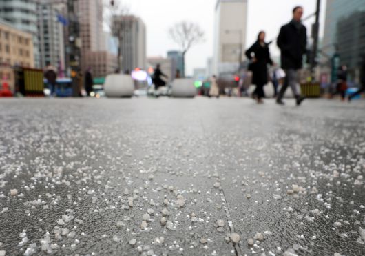 서울 종로구 광화문광장에 빙판길 방지를 위한 염화칼슘이 뿌려져 있다. 뉴시스 |