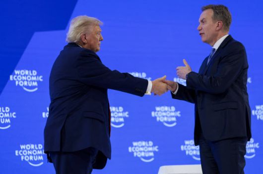 도널드 트럼프 미국 대통령이 지난 21일(현지시간) 스위스 다보스에서 열린 제56회 세계경제포럼(WEF) 연례회의에서 보르게 브렌데 WEF 회장 겸 최고경영자(CEO)와 악수하고 있다. (사진=로이터) |