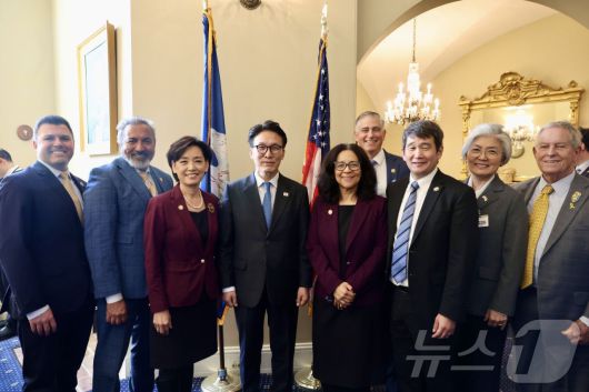 (서울=뉴스1) = 김민석 국무총리(왼쪽에서 네 번째)가 22일(현지시간) 미국 국회의사당에서 열린 미 하원 주요인사 초청 오찬 간담회에서 강경화 주미대사를 비롯한 참석자들과 기념촬영을 하고 있다. (총리실 제공. 재판매 및 DB 금지) 2026.1.23/뉴스1