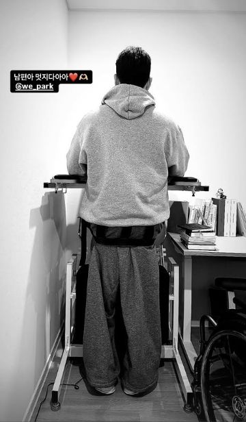 공개된 사진 속 박위는 재활보조기구에 의지해 몸을 일으킨 모습. 서 있는 박위의 뒷모습을 송지은이 촬영해 올린 것. 남편을 향한 애정을 한껏 드러내 이목을 집중시킨다.
