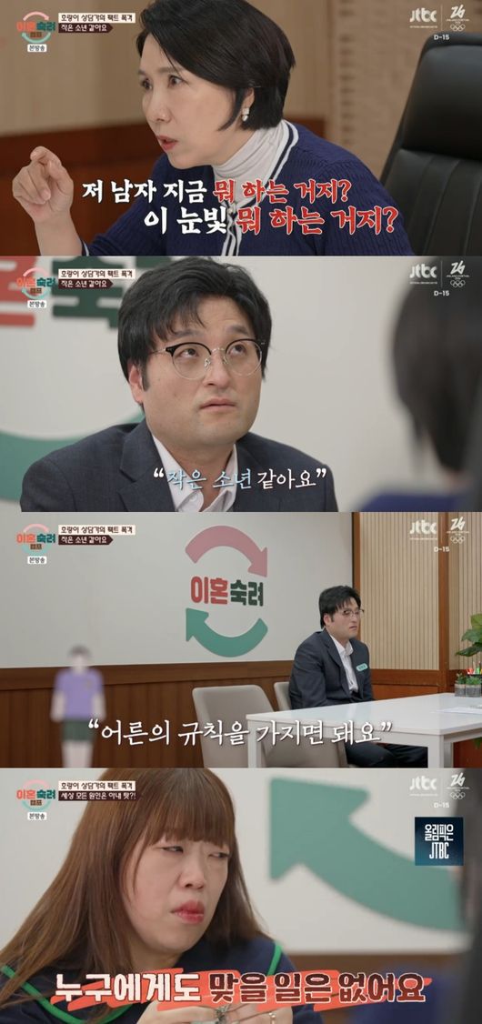이어진 심리 상담. 이호선은 남편에게 “나는 영상을 보면서 남편이 이상하다고 생각했다. 저 사람 누구지? 저 고집은 뭐지? 근데 가만 보니까 작은 소년 같다”라며 “멋진 남자, 멋진 남편으로 살아가려면 어른의 규칙을 가지면 된다”라고 이야기했다.