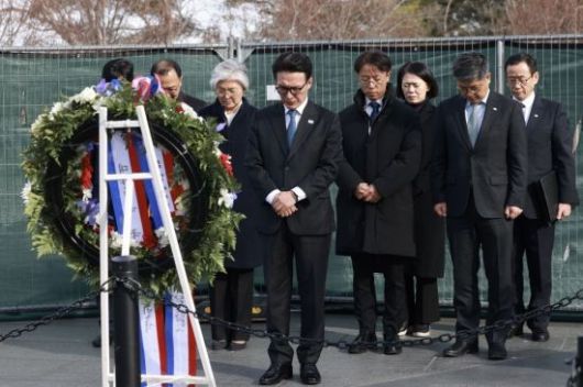김민석 국무총리가 22일(현지시간) 미국 한국전 참전기념공원을 방문, 헌화 및 묵념을 하고 있다. 2026.1.23 [총리실 제공]