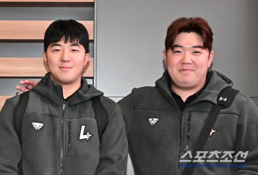 23일 SSG 랜더스 선수단이 인천공항 제2터미널을 통해 전지훈련을 위해 출국했다. SSG 이로운이 대구고 후배 김민준(왼쪽)과 함께 포즈를 취하고 있다. 인천공항=송정헌 기자songs@sportschosun.com/2026.01.23/