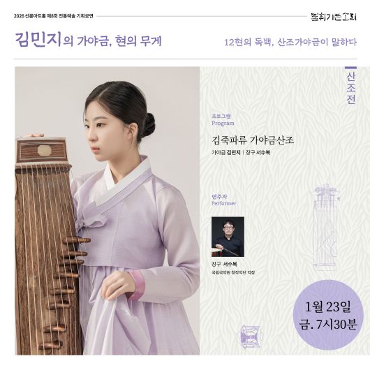 선릉아트홀의 전통예술 기획공연 제8회 불휘기픈소리 산조전 '김민지의 가야금, 현의 무게'가 1월 23일 금요일 오후 7시 30분에 열린다.