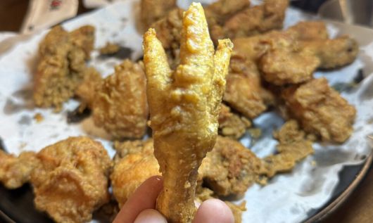 이 집 통닭은 어디에도 없는 맛이다. 우선 튀김옷에 콩, 찹쌀 등 10여가지 곡물이 들어간다. 생강 등을 넣어 우린 물이 튀김옷 반죽의 재료다. 전분과 소금도 조금 들어간다. 튀김옷의 절묘한 레시피는 김씨가 개발했고, 지금도 그 배율은 김씨와 장씨의 누나만 알고 있다고 한다. 닭도 염지를 안 한다. 통상 치킨 레시피 첫 줄은 염지하는 법이다. 가장 눈에 띄는 특징은 튀긴 닭발이 함께 나온다는 점이다. 허름한 포장마차에서 술안주로 나왔던 닭발. 이마저도 거의 사라지다시피 한 닭발이 이 집 역사와 함께 ‘생존’하고 있다. 과거 이 집 근처에는 닭전이 있었다. 푸드덕 날갯짓하는 산 닭을 파는 골목이었다. 닭을 산 이들은 통째로 양동통닭 집에 가져갔다. 닭발까지 튀긴 통닭이 탄생하게 된 배경이다. 이런 1960년대 풍경을 기억하는 노년층이 많다. 얇은 튀김옷 안의 보드라운 닭발 살을 살살 발라 먹다 보면 차분해진다. 가게 밖 솥단지 6개에서 들리는 지글지글 닭 튀기는 소리도 성가로 들린다. ‘나 홀로’ 먹는 닭발 튀김 한 조각이 주는 기쁨은 때로 ‘마음의 평화’를 건넨다. 맛이 주는 즐거움은 종종 고요를 선물하기 때문이다.