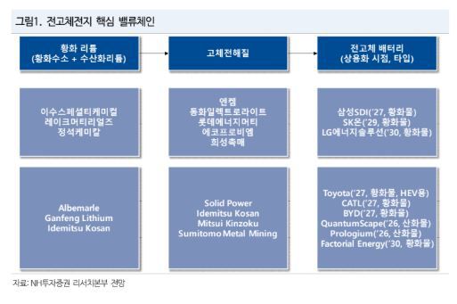 전고체 전지 시장의 본격 개화 시점은 2030년 이후로 보지만, 주식 관점에서는 인터배터리가 열리는 3월까지 가장 빠른 상용화 일정을 가진 삼성SDI를 비롯해 관련 전고체 밸류체인에 집중할 필요가 있다는 의견이 나온다. 관련 밸류체인으로는 셀(삼성SDI), 고체전해질(Solid Power, 에코프로비엠, 롯데에너지머티리얼즈), 황화리튬(이수스페셜티케미컬, 레이크머티리얼즈)이 거론된다. 주 연구원은 “전고체의 본격 개화는 시간이 필요하지만, 주식 시장은 이벤트와 상대적 상용화 속도를 먼저 반영한다”며 “3월까지는 삼성SDI를 중심으로 전고체 밸류체인 전반을 점검할 필요가 있다”고 짚었다.