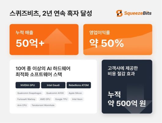AI 경량화·최적화 기술 스타트업 스퀴즈비츠가 2년 연속 흑자를 기록했다. 창업 4년 만에 누적 매출 50억 원을 달성했다.