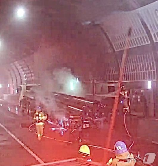 (수원=뉴스1) 김기현 기자 = 23일 오전 6시 15분께 경기 수원시 영통구 하동 영동고속도로 수원 방향 광교방음터널 내부를 달리던 25톤 트럭에서 불이 났다.