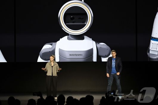 세계 최대 가전·정보기술(IT) 전시회 'CES 2026' 개막을 하루 앞둔 5일(현지시간) 미국 네바다주 라스베이거스 만달레이베이에서 열린 현대차그룹 프레스 컨퍼런스에서 잭 잭코우스키 보스턴다이나믹스 아틀라스 개발 총괄과 아야 더빈 보스턴다이나믹스 휴머노이드 응용전략 담당이 차세대 전동식 아틀라스 개발형 모델을 소개하고 있다. (공동취재) 2026.1.6/뉴스1 ⓒ News1 황기선 기자 |