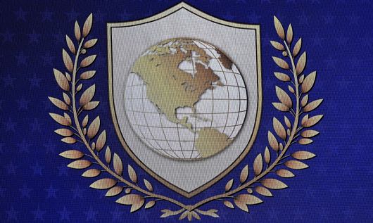 22일(현지시각) 스위스 다보스에서 개최한 세계경제포럼(WEF) 중 열린 평화위원회 헌장 서명식에서 공개된 평화위 로고의 모습. 지구본을 올리브 가지가 감싸고 있는 모습이 유엔 로고와 유사하다. AFP 연합뉴스 |