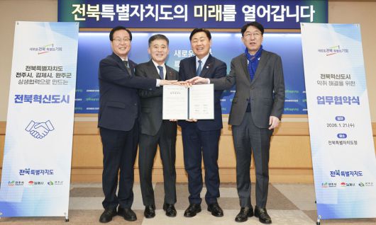 전북도는 김관영 도지사와 우범기 전주시장, 정성주 김제시장, 유희태 완주군수가 '혁신도시 악취 해결을 위한 업무협약'을 체결했다고 23일 밝혔다.