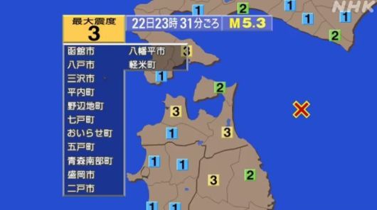 이번 지진으로 홋카이도 하코다테시, 아오모리현 하치노헤시와 미사와시, 이와테현 모리오카시와 니노헤시 등에서는 진도 3의 흔들림이 관측됐다.