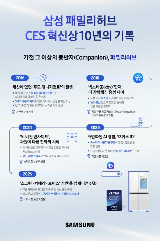 해당 인포그래픽은 2016년부터 올해까지 패밀리허브 냉장고가 미국 라스베이거스에서 열리는 세계 최대 가전·정보기술(IT) 박람회인 CES 무대에서 이뤄온 기술 진화와 혁신 성과를 연도별로 정리한 것이다. 삼성전자가 냉장고를 단순 가전을 넘어 인공지능(AI) 기반 생활 동반자로 발전시켜 온 과정을 담고 있다.