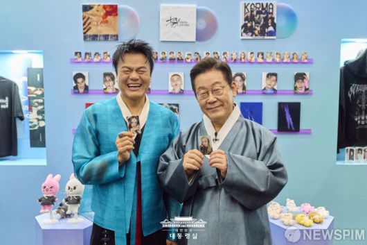 [서울=뉴스핌] 이재명 대통령이 1일 경기 고양시 킨텍스에서 열린 대중문화교류위원회 출범식에서 박진영 대중문화교류위원회 공동위원장과 가수들의 포토카드를 들어보이고 있다. [사진=대통령실] 2025.10.01 photo@newspim.com |