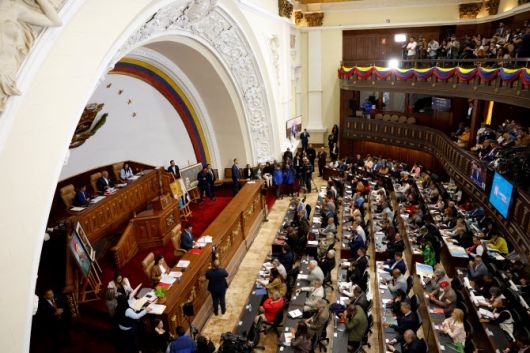 베네수엘라 국민의회의 호르헤 로드리게스 의장과 페드로 인판테 제1부의장, 그레시아 콜메나레스 제2부의장이 22일(현지시간) 베네수엘라 카라카스에서 열린 국민의회 본회의에 참석해 석유 개혁안을 논의하고 있다. (사진=로이터) |