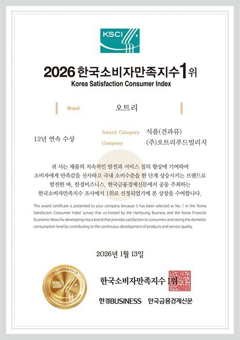 ㈜오트리푸드빌리지가 지난 13일 서울 강남구 엘리아나 호텔에서 열린 ‘2026 한국소비자만족지수 1위’ 시상식에서 12년 연속 식품(견과류) 부문 1위를 차지했다.