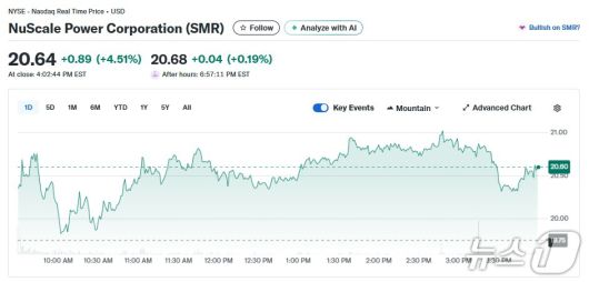 22일(현지 시각) 뉴욕증시에서 SMR은 4.51% 급등한 20.64달러를 기록했다.