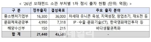 23일 중소벤처기업부는 문화체육관광부, 해양수산부, 한국벤처투자와 ‘모태펀드 2026년 1차 정시 출자 공고’를 통해 이 같은 방침을 발표했다.