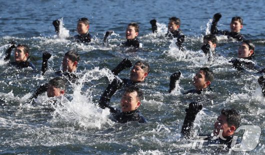전국적으로 맹추위가 기승을 부린 22일 경남 창원 진해 군항에서 해군 심해잠수사(SSU)들이 차가운 겨울 바다로 뛰어들어 군가를 부르며 혹한기 훈련을 하고 있다. 2026.1.22/뉴스1 ⓒ News1 윤일지 기자 |