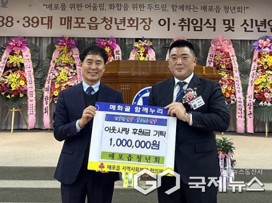 매포읍청년회(회장 장남석)는 최근 열린 제39대 회장 취임식에서 단양군에 이웃돕기 성금 100만 원을 기탁했다.