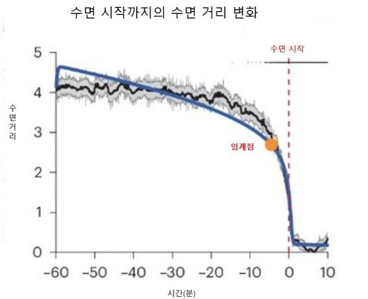 연구진은 이어 1000여명의 실험참가자를 모집해 얻은 뇌파 데이터를 이 모델에 입력해 뇌 활동과 수면 시작 사이의 거리, 즉 수면거리를 측정했다. 그 결과 수면 10분 전까지는 수면거리가 거의 변하지 않다가 수면 시작 4.5분 전에 급격히 줄어드는 것으로 나타났다.