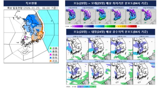 (더쎈뉴스 / The CEN News 이수현 기자) 오늘(23일)부터 내일 아침까지 전국 대부분 지역의 아침 기온이 -10도 안팎으로 떨어지며 강추위가 이어지겠다. 중부지방과 전라권을 중심으로 눈이 내리고, 강원동해안과 경상권을 포함한 일부 지역에서는 건조와 강풍 현상이 겹치며 안전에 각별한 주의가 요구된다.