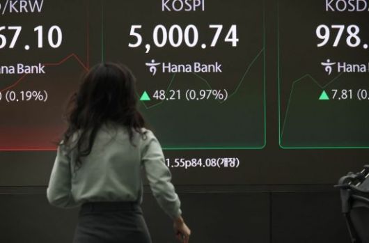 코스피가 장중 5000선을 재돌파한 가운데 23일 서울 중구 하나은행 본점 딜링룸에서 직원이 증시와 환율 등을 모니터하고 있다. 이날 코스피는 전 거래일(4952.53)보다 31.55포인트(0.64%) 상승한 4984.08에 장을 시작했다. <ⓒ투자가를 위한 경제콘텐츠 플랫폼, 아시아경제(www.asiae.co.kr) 무단전재 배포금지>