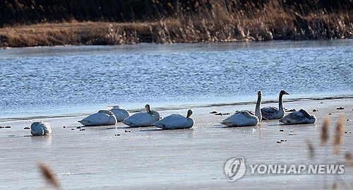 (강릉=연합뉴스) 유형재 기자 = 강추위가 이어진 23일 강원 강릉시 경포저류지에서 멸종위기 야생생물 II급이자 천연기념물인 큰고니 가족이 몸을 잔뜩 웅크린 채 추위를 견디고 있다. 2026.1.23