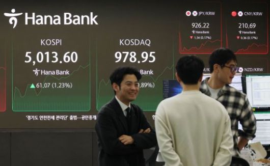 코스피가 장중 5000선을 재돌파한 가운데 23일 서울 중구 하나은행 본점 딜링룸에서 직원이 증시와 환율 등을 모니터하고 있다. 이날 코스피는 전 거래일(4952.53)보다 31.55포인트(0.64%) 상승한 4984.08에 장을 시작했다.