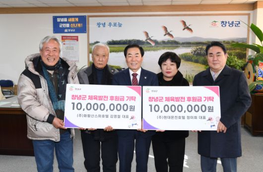 창녕군 화왕산스파호텔(대표 김영철)과 현대온천호텔(대표 정미희)이 창녕군 체육발전 후원금으로 각 1천만원을 기탁했다.
