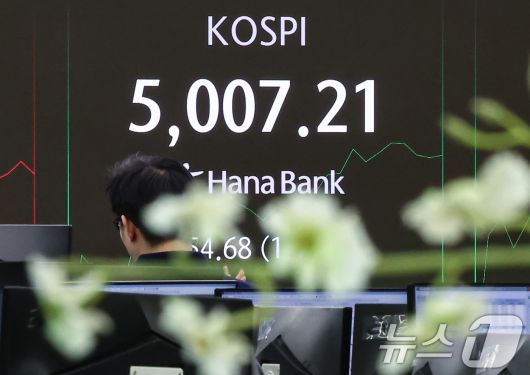 코스피가 장중 사상 처음 5000선을 돌파한 지난 22일 오후 서울 중구 하나은행 본점 딜링룸 전광판에 5000돌파 기념 화면이 나타나고 있다. 2026.1.22/뉴스1 ⓒ News1 박지혜 기자 |