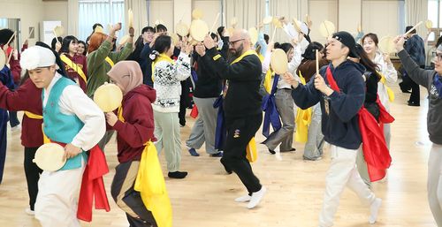 (정읍=연합뉴스) 지난 22일 전북 정읍시 글로벌 청년 겨울캠프에 참여한 외국 청년들이 우도농악과 씨름을 체험하며 즐거운 추억을 쌓고 있다.
