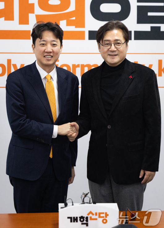 (서울=뉴스1) 유승관 기자 = 이준석 개혁신당 대표가 23일 서울 여의도 국회에서 홍익표 청와대 정무수석을 접견, 기념 촬영을 하고 있다. 2026.1.23/뉴스1
